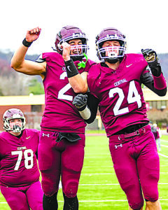 Wheeling Central’s Nico Kusic (left) and Max Olejasz (right) celebrate a touchdown during the Maroon Knights’ playoff victory over Tolsia. Central will face Pendleton County on Friday in a Class A state semifinal game.
