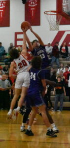 Martins Ferry’s Eli Smith (13) grabs a rebound away from Union Local’s Brody Kerns (20) during Tuesday night’s game inside ‘The Hangar’ on the Union Local schools campus in Morristown. Smith scored 15 points and grabbed eight rebounds to lead the Purple Riders to a 51-37 victory over the Jets. Martins Ferry’s Elijah Roby (24) is also pictured.