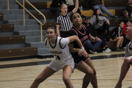 John Marshall’s Rilee Storm boxes out Steubenville’s Jazmin Montgomery during a previous regular season game between the Big Red and Monarchs, who are meeting for the third time this season Saturday in the OVAC 5A championship game.