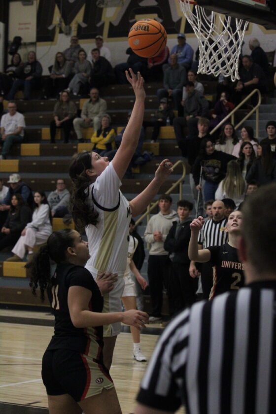 John Marshall’s Paislee Babiczuk scores inside Monday against the University Hawks. Babiczuk had 10 points and 12 rebounds in the Monarch comeback.