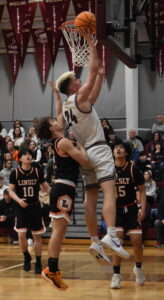 Wheeling Central’s Max Olejasz (24) scores two of his 16 points Friday night against Linsly on Coach Skip Prosser Court inside the Wheeling Central Athletic Center in East Wheeling. The Maroon Knights moved to 13-0 with a 73-58 victory before a standing-room-only crowd.