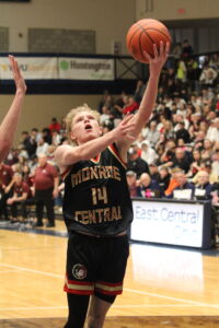 Monroe Central’s Caedyn Silva exploded in the third quarter for 15 of his team-high 22 points, hitting three 3’s in the quarter, but the Seminoles still trailed 63-38 heading into the final period.
