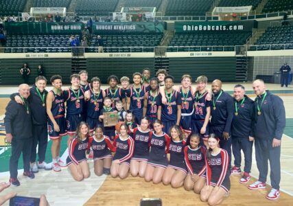 The Steubenville Big Red boys basketball team, pictured with their District Championship trophy and medals after defeating Chillicothe on Wednesday inside Ohio University’s Convocation Center.