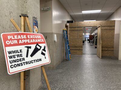 Signs alert the public to ongoing construction on the first floor of the City-County Building in Wheeling. (Photo by Joselyn King)