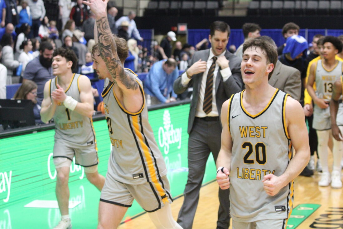 - The West Liberty Hilltoppers’ Myles Montgomery (right), Dante Spadafora (middle) and Aiden Davis (left) celebrate while running off the court Saturday inside WesBanco Arena.
