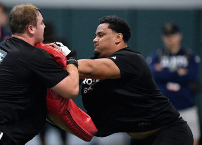 AP Photo Miami offensive tackle Francis Mauigoa, right, works out during the school's NFL football pro day, Monday March 23, 2026, in Coral Gables, Fla.