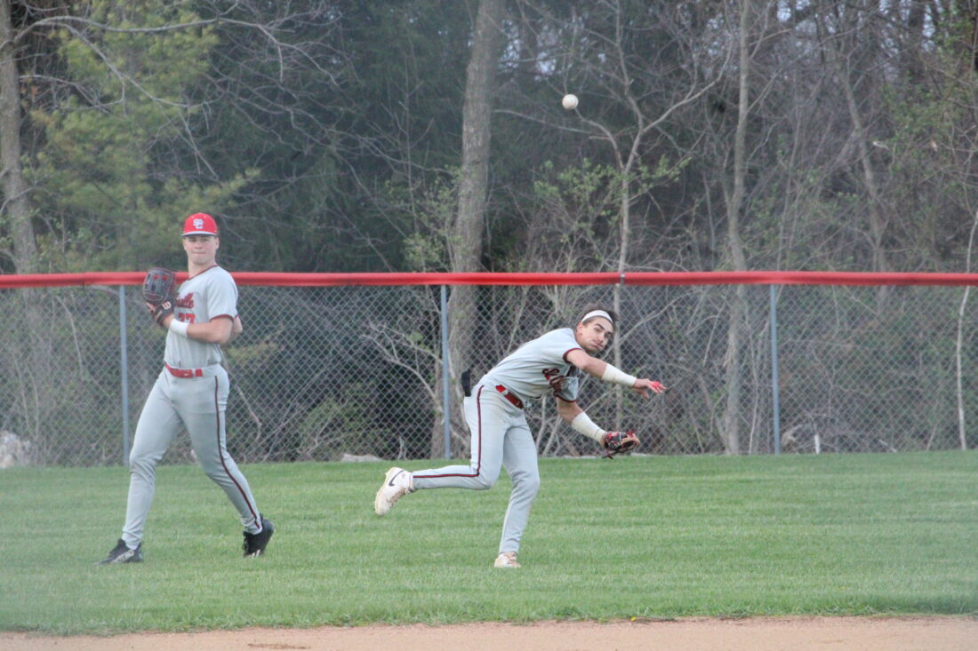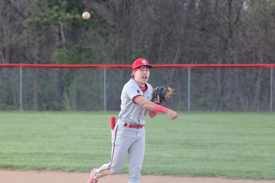 - St. Clairsville’s Matheson King makes a throw from second base Monday. King tallied three RBI in the Red Devils’ 12-2 victory.