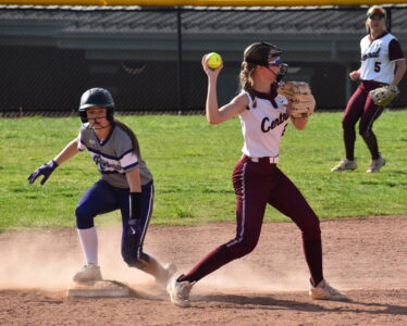 Photo by Kim North Wheeling Central shortstop Bella Rine relays the ball to first base after forcing out Martins Ferry’s Kendyl Brandon at second during Thursday’s game in Martins Ferry. Rone had three singles and two RBI in the Maroon Knights’ 6-3 victory.